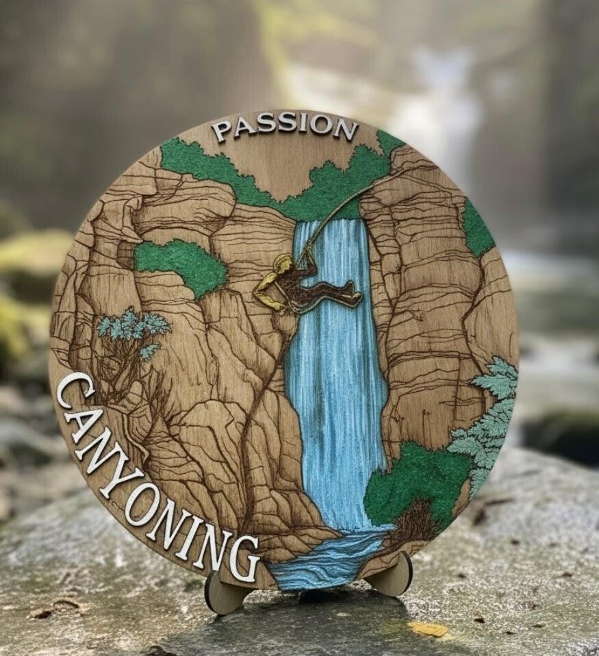 Chaque élément est découpé, peint et assemblé avec soin pour offrir un rendu harmonieux et immersif. Le mot “Passion” apparaît en premier plan, suivi de “Canyoning”, pour exprimer pleinement l’esprit de liberté et d’adrénaline propre à cette discipline.